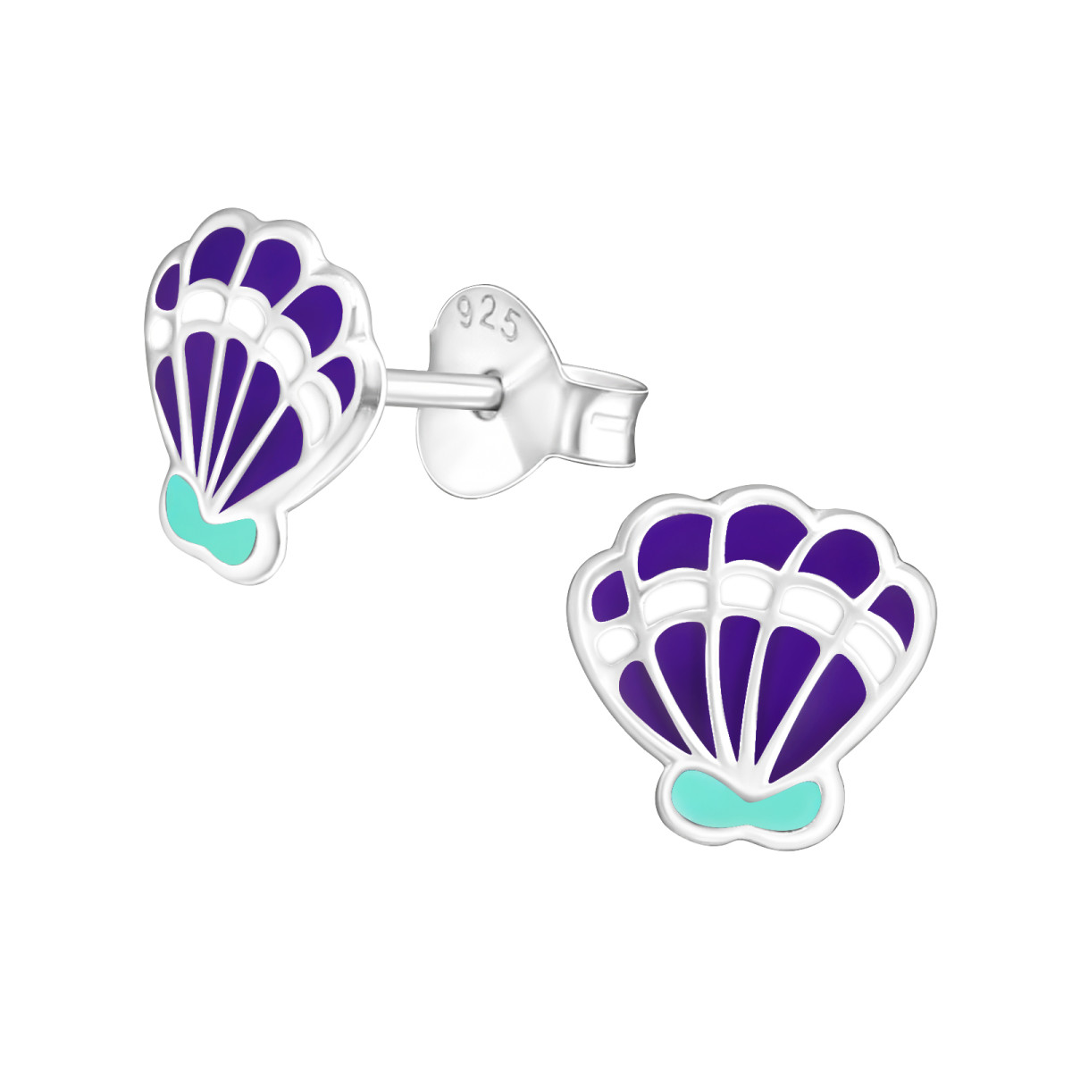 Lila kagyló stift gyermekfülbevaló, 925 ezüst , epoxy, világos zöld, fehér,