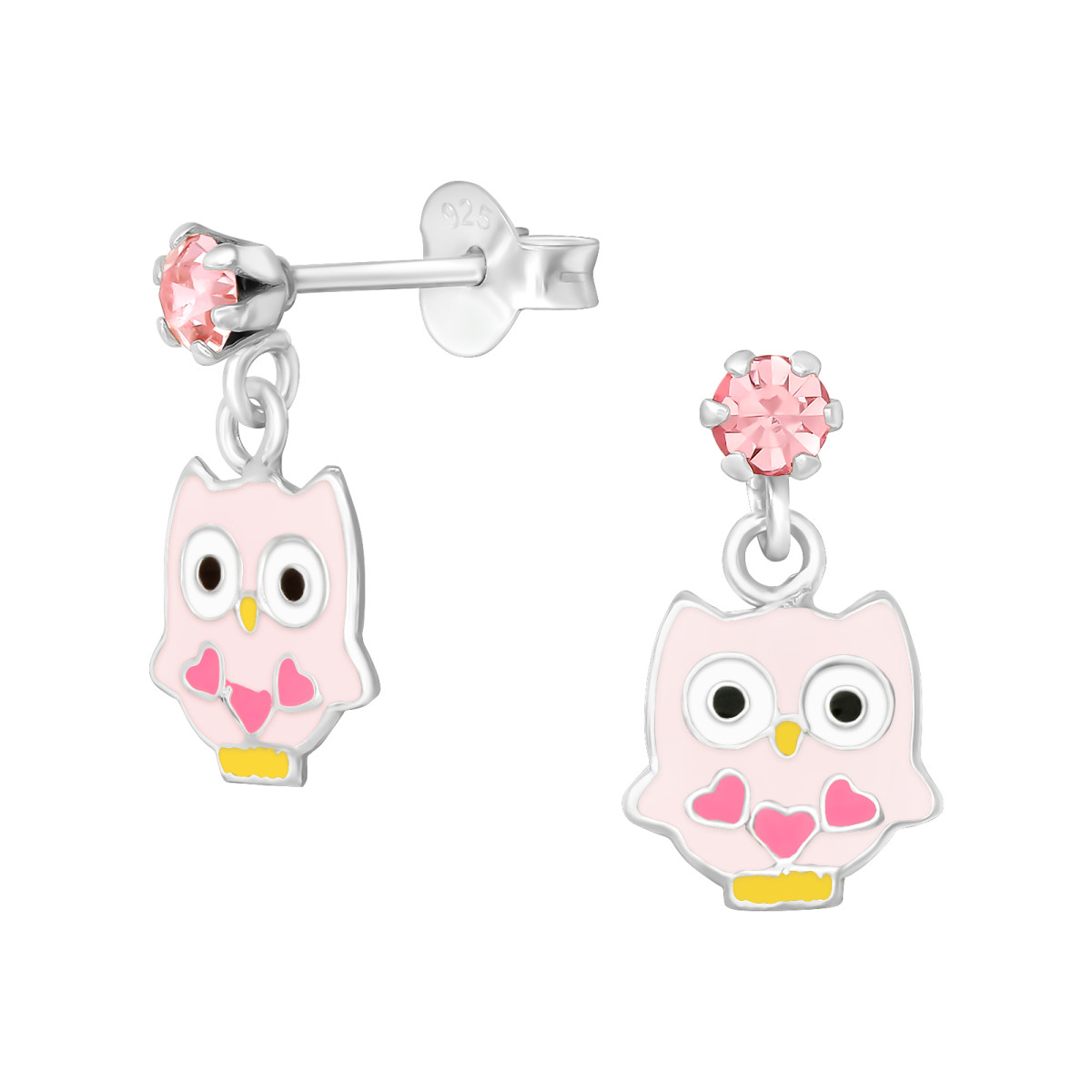 Baglyos gyermek ezüst kristály fülbevaló, 1 pár, epoxy, sárga, fekete, fehér, rózsaszín, világos