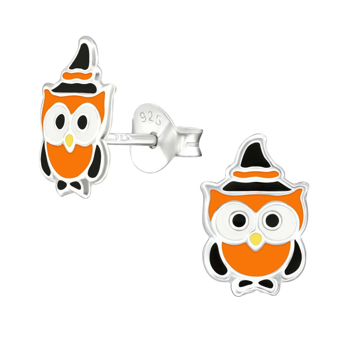 Bagoly boszi színes stift gyermek fülbevaló, 925 ezüst, 1 pár, epoxy, fekete, sárga, fehér, narancs