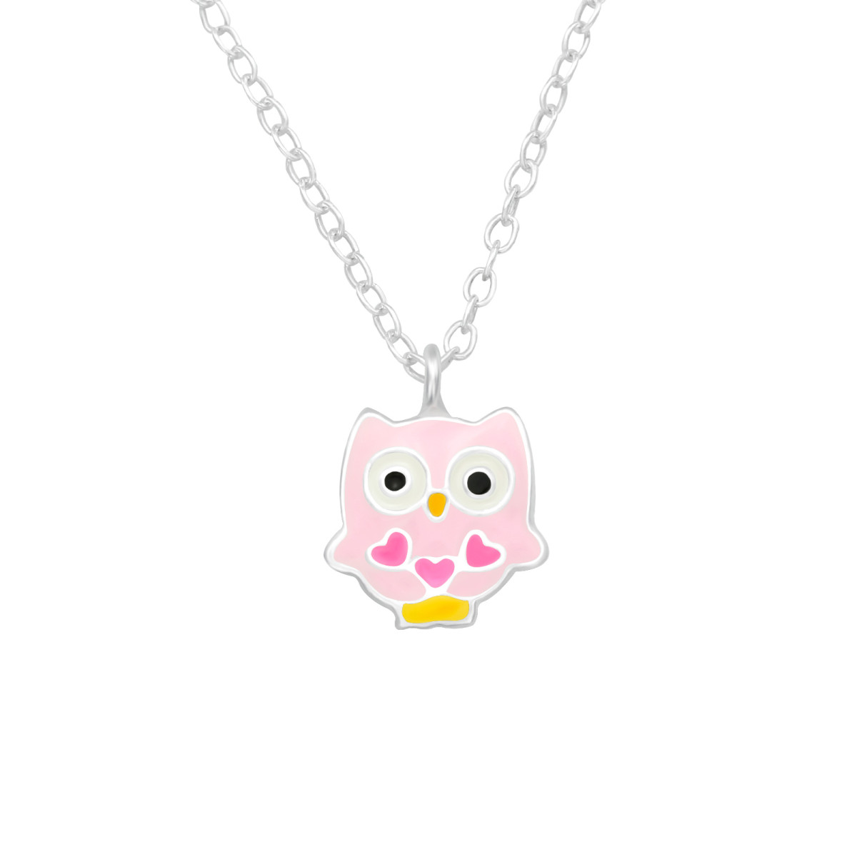 Bagoly lal ezüst gyermek nyaklánc medállal, epoxy, sárga, fekete, fehér, rózsaszín, világos