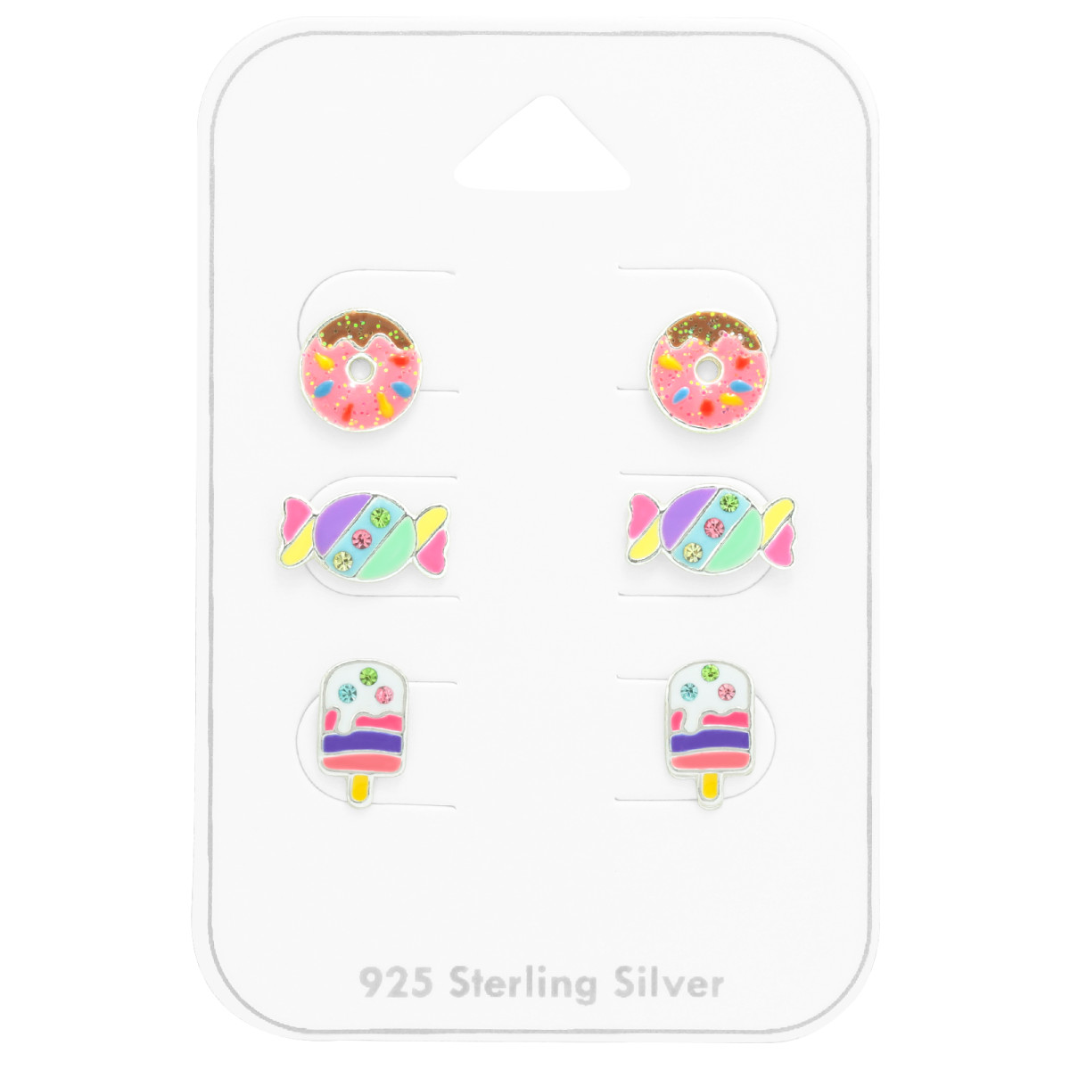 Fánk cukor jégkrém gyermek ékszer szett, 925 ezüst, epoxy, rózsaszín csillogó, világos zöld, sárga, kék, halványsárga, világoskék, fehér, világos lila, sötét lila, piros, világos rózsaszín, barna csillogás, sötét , kristály köves