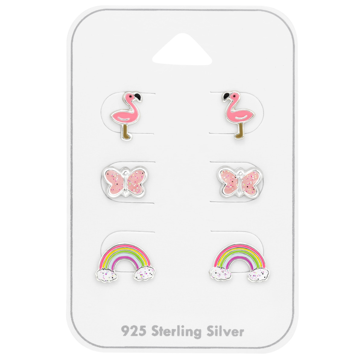 Flamingó, Pillangó Szivárvány Szett gyermek bedugós fülbevaló kártyán 925 ezüst - 3 pár, epoxy, piros, fekete, lila, sárga, rózsaszín, fehér, barna