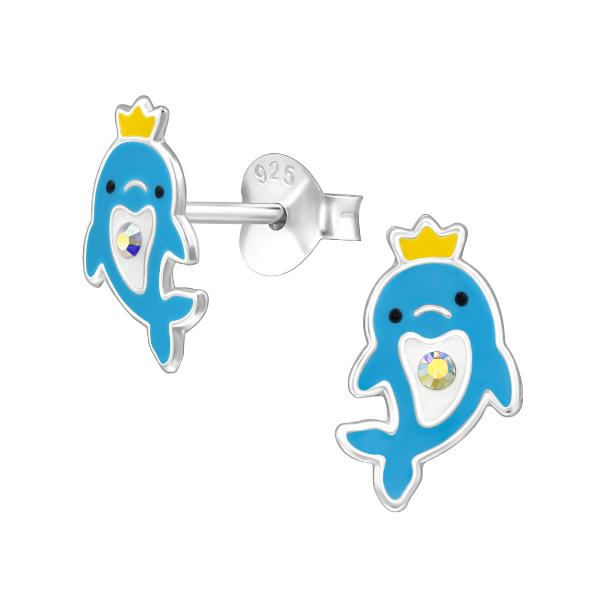 TAG-ek: Delfin, Koronával, gyermek, bedugós, fülbevaló, 95, ezüst, epoxy, fekete, sárga, fehér, kék, kristály, köves