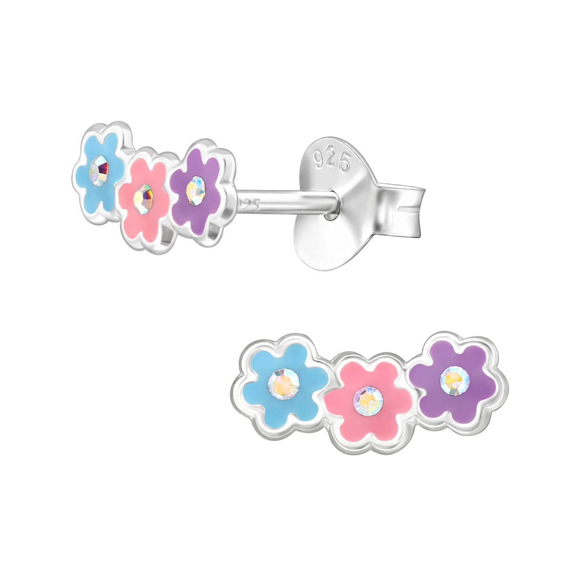 Három Virág gyermek bedugós fülbevaló 925 ezüst - 1 pár, epoxy, kék, lila, rózsaszín, kristály köves
