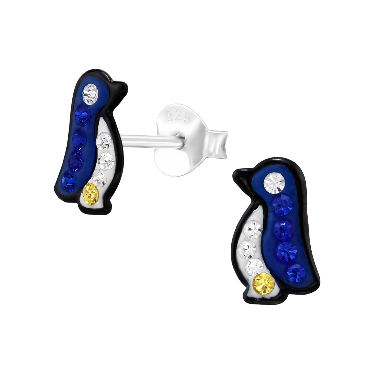 Kék Neon Pingvin gyermek bedugós fülbevaló 925 ezüst - 1 pár, epoxy, fekete, permet, kristály köves