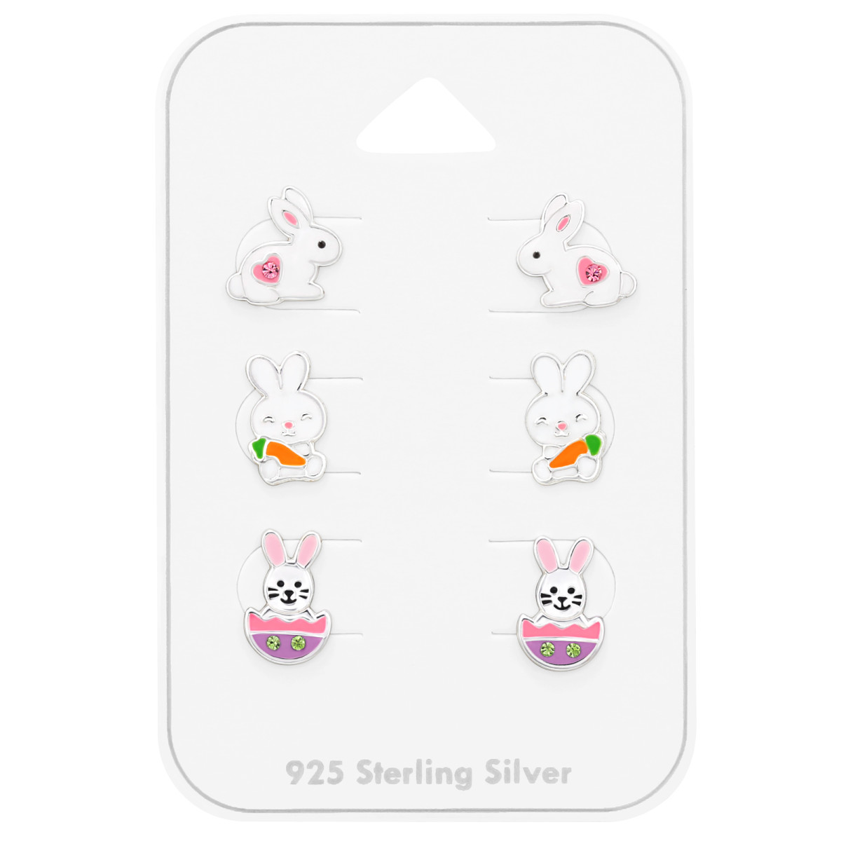 Húsvéti Szett gyermek bedugós fülbevaló kártyán 925 ezüst - 3 pár, epoxy, fehér, fekete, narancs, világos lila, light rózsaszín, zöld, kristály köves