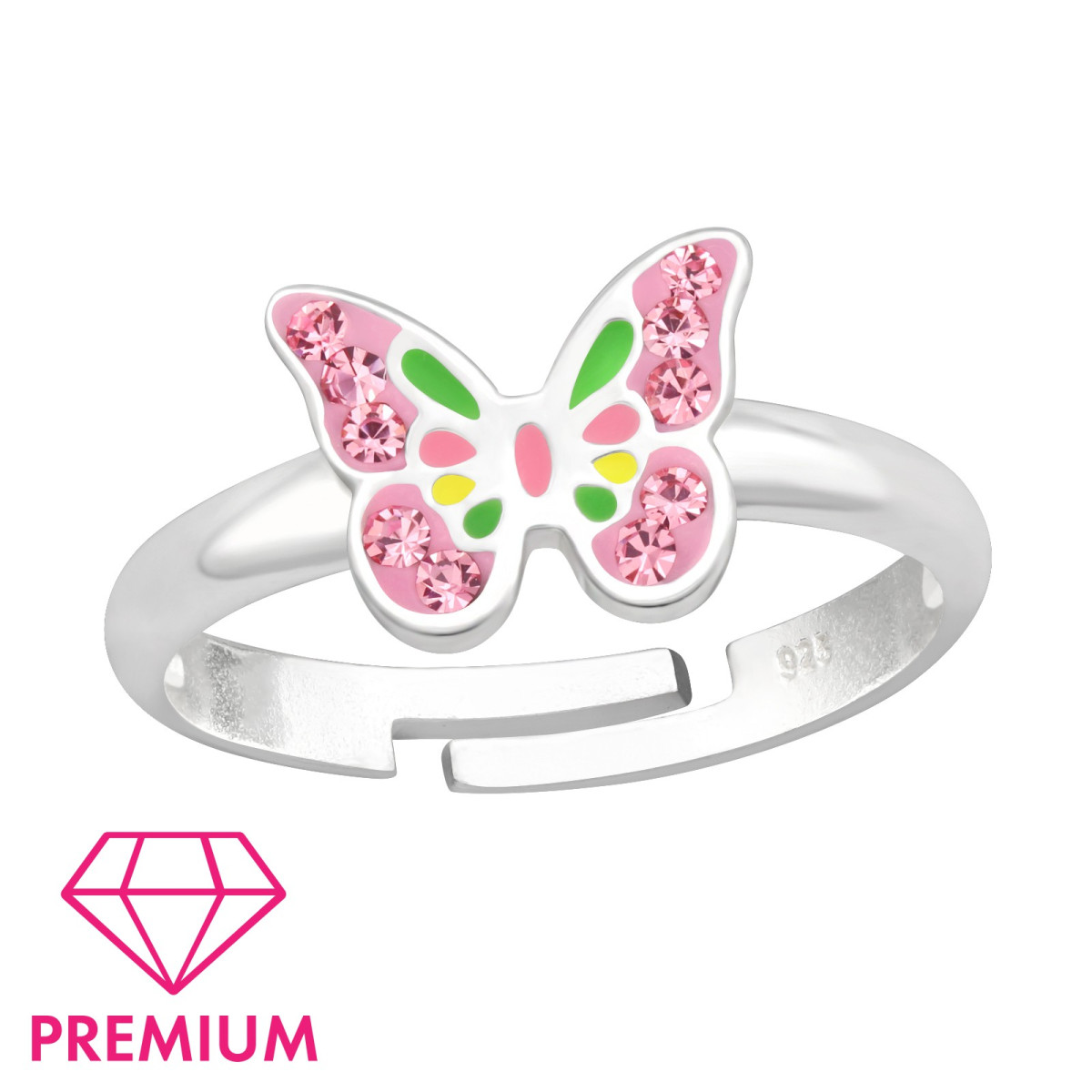 Kristályos Lepkés gyermek ezüst gyűrű, állítható, epoxy, zöld, sárga, rózsaszín