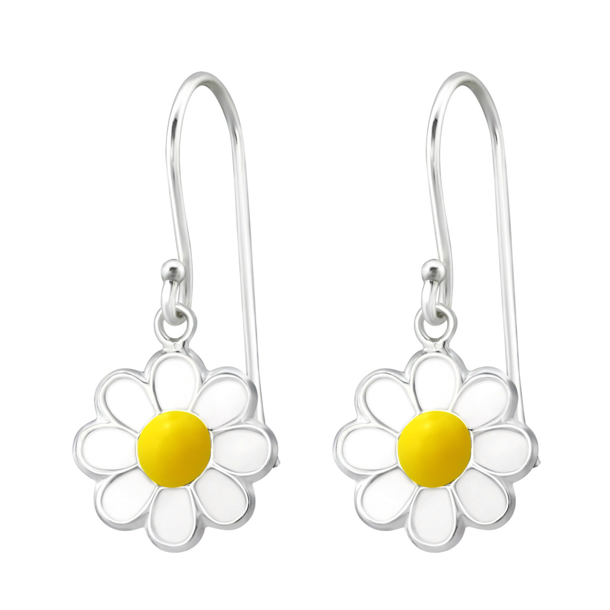 Margaréta virágos gyermek ezüst akasztós fülbevaló, 1 pár, epoxy, fehér, sárga