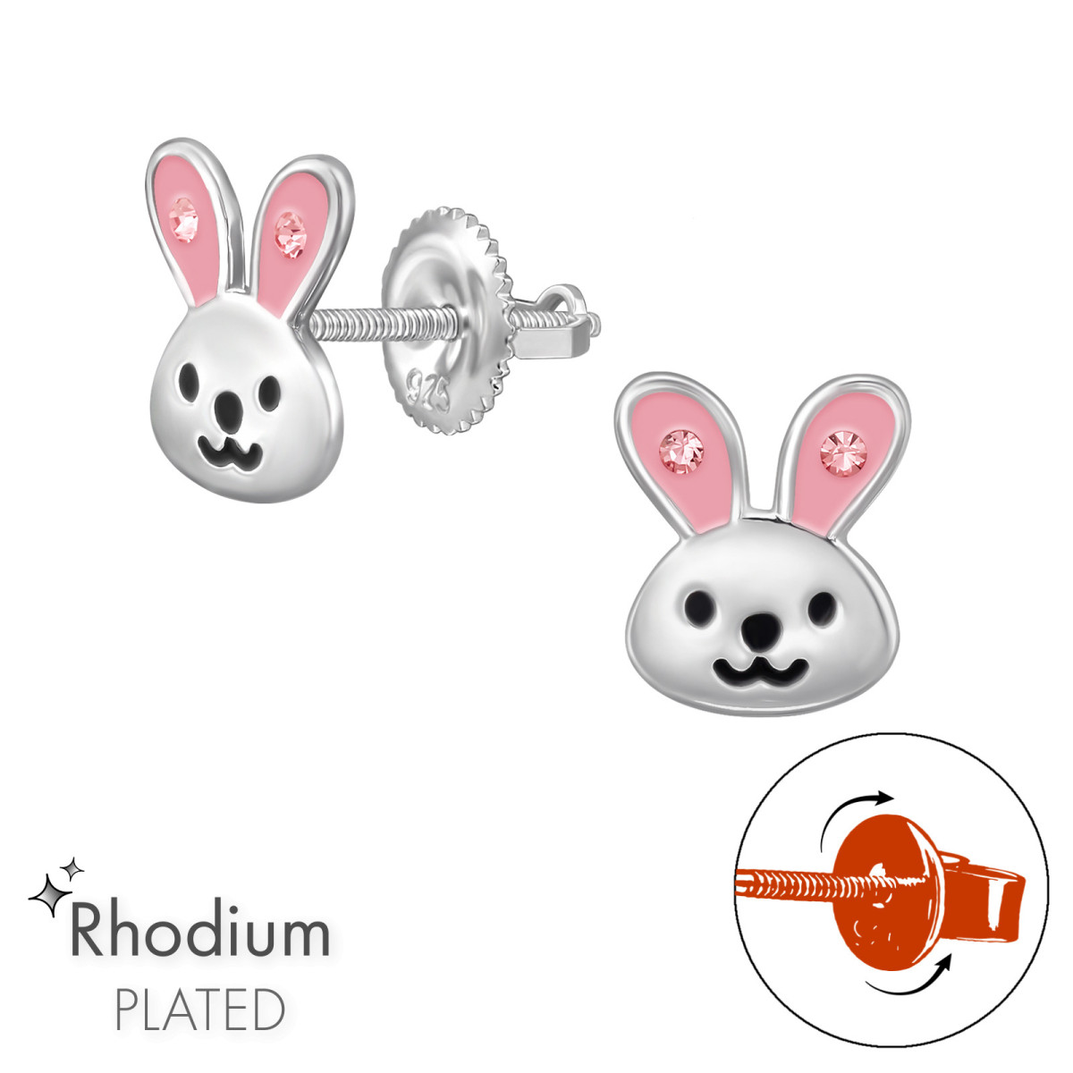 Nyúl gyerek csavaros fülbevaló 925 ezüst - 1 pár, epoxy, fekete, kristály köves