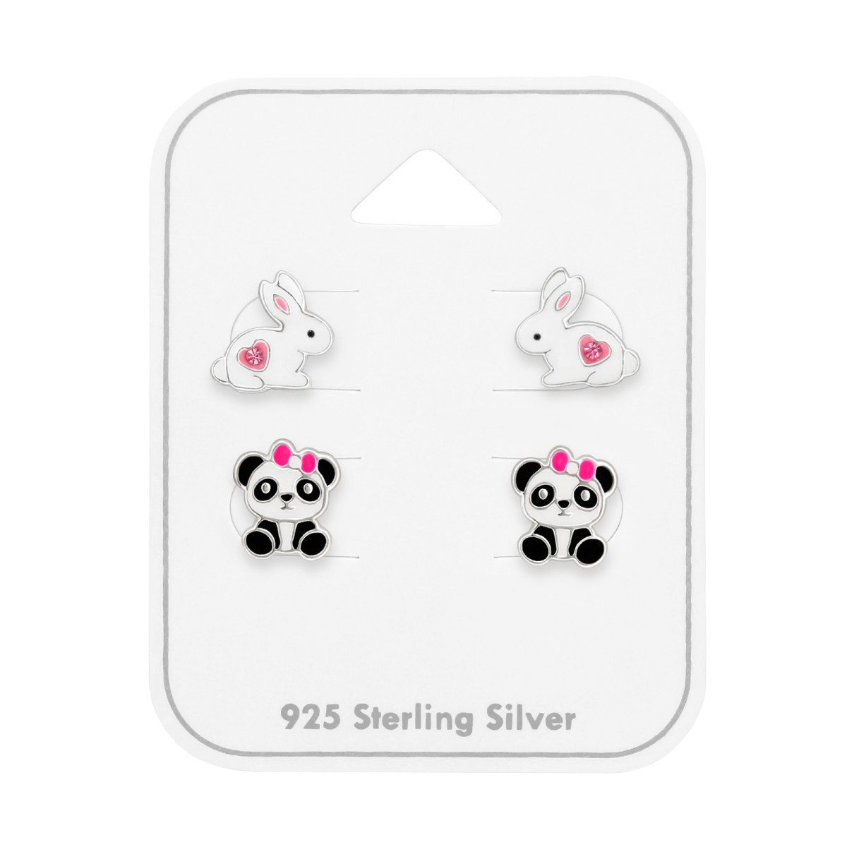 Panda, nyuszi gyerek ékszer szett, 925 ezüst - 2 pár fülbevaló, epoxy, fekete, fehér, rózsaszín, kristály köves