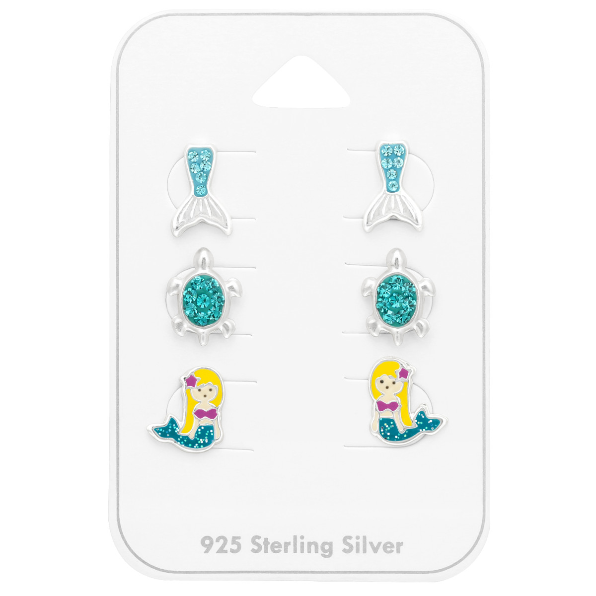 Sellő farok teknős gyermek ékszer szett, 925 ezüst, epoxy, sötét kék csillogás, fekete, sárga, fukszia, krém, kristály köves