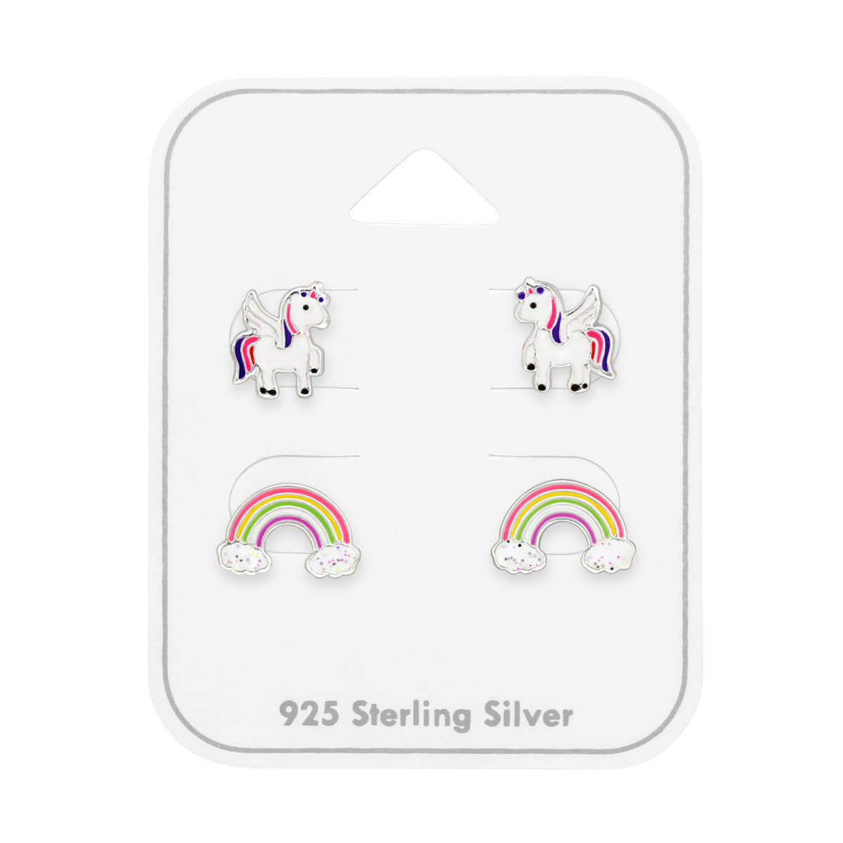 Szivárvány unikornis gyerek ékszer szett, 925 ezüst - 2 pár fülbevaló, epoxy, fehér csillogó, rózsaszín, fekete, , világos zöld, piros, világoskék, sárga, lila, sötét rózsaszín