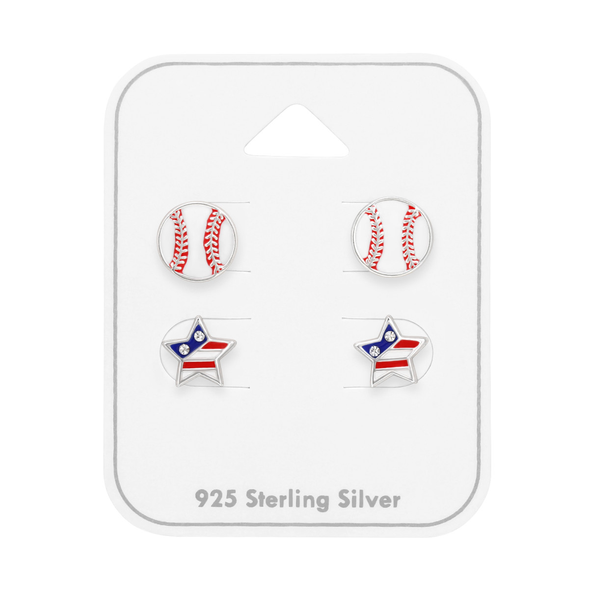 USA sport baseball gyerek ékszer szett, 925 ezüst - 2 pár fülbevaló, epoxy, kék, fehér, piros, kristály köves