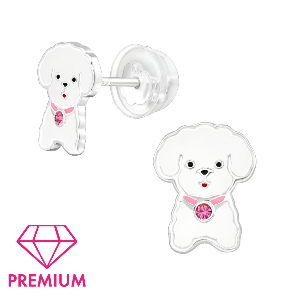Uszkár Kutya prémium gyermek bedugós fülbevaló 925 ezüst - 1 pár, epoxy, fekete, fehér, rózsaszín, kristály köves